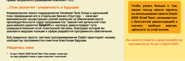Borland Software Corporation - лидирующий поставщик систем, упрощающих разработку, развертывание и интегрирование приложений. Обеспечивая лучшими решениями, направленными на возможность взаимодействия платформ, Borland дает доступ к созданию корпоративных систем на основе Веб-технологий, при этом гарантируя разработчику сохранение связи с унаследованными системами. Корпорация Borland основана в 1983, штаб-квартира расположена в Scotts Valley, California; компания имеет представительства более чем в 20 странах.