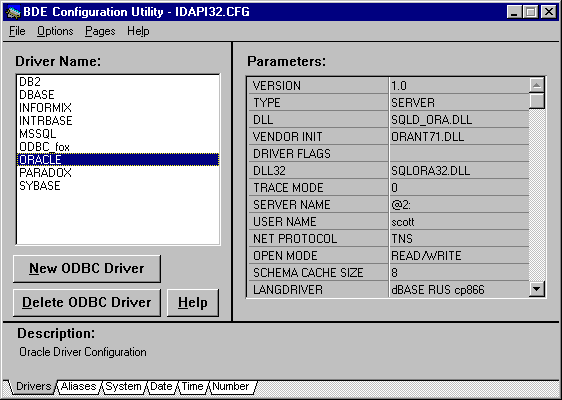 Для корректного отображения русских букв и установки правильного порядка алфавитной сортировки можно использовать драйверы dBase RUS CP866 или Paradox ANSI Cyrillic в зависимости от того, какая кодировка - DOS или Windows - будет использоваться. Однако корректная работа с русским языком будет обеспечена только в том случае, если удачно подобрано сочетание трех параметров языковой настройки: языковой настройки сервера (она указывается при его установке), языковой настройки клиентской части (значение HKEY_LOCAL_MACHINE//SOFTWARE)//ORACLE//NLS_LANG реестра Windows 95) и собственно языкового драйвера BDE. Подробности языковой настройки клиентской части и сервера можно найти в документации к серверу Oracle.