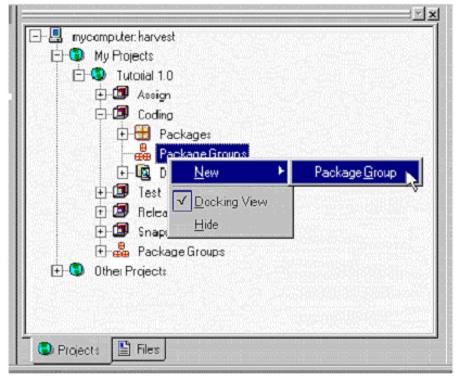 - В закладке рабочего места Projects выберите проект или состояние, где необходимо создать группу пакетов.