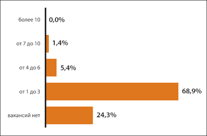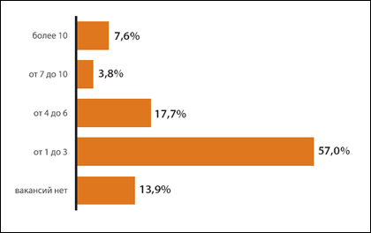 Прямым подтверждением дефицита кадров является большое количество открытых позиций в области ИБ. Легко заметить, что подавляющее большинство банков (86,1%) имеют хотя бы одну ИБ-ваканскию. 4-6 специалистов сейчас нужны в 17,7% банков, а о наличии 7-10 вакансий заявлено в 3,8% случаях. Есть и чемпионы по неукомплектованности - около 8% организаций имеют более 10 открытых инженерных вакансий. Но есть и те, у кого проблем нет. Вакансии технических ИБ-специалистов