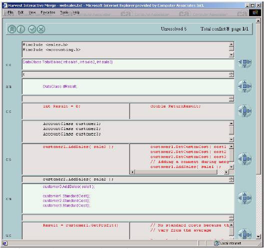 Страница Interactive Merge отображает результат сравнения двух версий элемента, выделяя конфликтующие блоки и совпадающие блоки. Каждый совпадающий блок размещается по всей ширине страницы Interactive Merge, а версии конфликтующих блоков отображается в двух соседних колонках. Чтобы принять одну из версий конфликтующего блока в итоговую версию, используйте кнопку Take. Вы можете использовать линейку прокрутки с правой стороны страницы для перемещения вверх или вниз в файле.