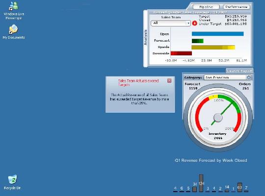 В BusinessObjects XI 3.0 улучшены дизайн и взаимодействие с пользователями Xcelsius. Процесс преобразования данных из Excel теперь происходит внутри средства проектирования Xcelsius Enterprise. Благодаря этому не нужно открывать Excel. Хотя электронные таблицы Excel по-прежнему поддерживаются в качестве источника данных, вам никогда не потребуется заново импортировать таблицу, чтобы отладить формулы или форматы. Это изменение упрощает процесс создания и одновременно помогает смягчить сомнения ИТ-специалистов насчет использования Excel в качестве средства бизнес-аналитики. Для проектирования и создания новых визуальных компонентов или аналитики для Xcelsius доступен пакет разработки программ (SDK). Этот набор средств разработки и документации позволяет проектировщикам добавлять в библиотеку дизайнера варианты внешнего оформления и компоненты. Это улучшение расширяет возможности создания специализированных компонентов информационных панелей с помощью Xcelsius Enterprise, а затем размещения этих средств аналитики внутри Dashboard Builder. В Xcelsius 2008 собраны улучшения, которые позволяют более удобно создавать надежные информационные панели. В число новых возможностей входят обновления в интерфейсе пользователя и браузер компонентов. Возможность вырезать и вставить аналитику из одного файла .xlf в другой исключает избыточность. Эти улучшения также упрощают манипуляцию данными и их выбор, а также сокращает количество запросов, необходимых для подключения к "живым" данным. Интеграция с компонентом Adobe LiveCycle Data Services (LCDS) позволяет создавать информационные панели, работающие в реальном масштабе времени. LCDS предлагает механизм извлечения данных из систем работы с данными реального времени. Благодаря интеграции с LCDS можно обновлять модели Xcelsius на основе изменений в событиях, например, при достижении цели продаж при запуске нового продукта. Рисунок 5. Встраивание аналитики Xcelsius в Crystal Reports для большей интерактивности. Пакет BusinessObjects XI 3.0 также обеспечивает более тесную интеграцию с другими продуктами Business Objects. Например, Xcelsius позволяет экспортировать визуальную модель в Crystal Reports. Объединение подробных данных с итоговой визуализацией позволяет предоставлять информацию более удобным способом. Также в версии Xcelsius Enterprise еще более улучшена связь с вселенными Business Objects и упрощено создание веб-сервисов для использования компонентами Xcelsius. Перемещение этих корпоративных информационных панелей из разработки в промышленное использование будет улучшено с помощью управления жизненным циклом. BI Widgets Новым компонентом платформы BusinessObjects Enterprise является BI Widgets. Это среда для создания виджетов, которая позволяет предоставить быструю аналитику прямо на настольный компьютер любому сотруднику - от директора до только что нанятого специалиста. BI Widgets упрощает доступ к основной информации и облегчает ее контроль. При этом не нужно менять существующую инфраструктуру бизнес-аналитики. BI Widgets распространяет представление существующих данных бизнес-аналитики на новые аудитории и повышает эффективность самостоятельной работы пользователей. При этом эффективно используются такие возможности платформы бизнес-аналитики Business Objects, как существующий репозиторий и модель безопасности. Конечные пользователи могут искать в нескольких репозиториях BusinessObjects Enterprise, а затем перетаскивать файл
