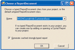Теперь давайте рассмотрим функции Crystal Reports for Visual Studio .NET для кешированных отчетов. Перетащите разработчик компонентов ReportDocument на плоскость разработки ViewReport.aspx и выберите ProjectName.CustomersBasic из Name: комбинированного списка в диалоговом окне Choose a ReportDocument, не нажимая кнопку OK. Обратите внимание на флажок "Generate cached strongly typed report" ("Создать кешированный строго типизированный отчет") (см. рис.11).