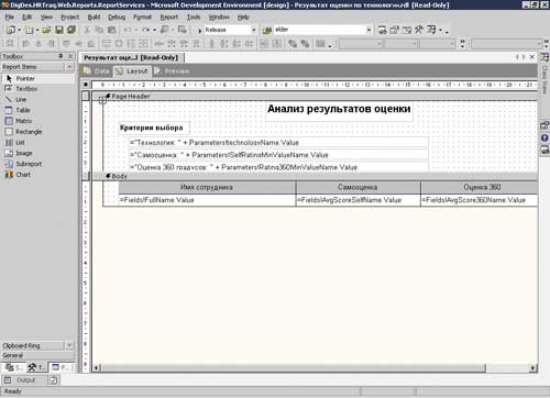 В процессе создания шаблона отчета можно удобно и быстро посмотреть на то, что получается. Для этого существует вкладка Preview (рис. 8). В связи с тем, что данный отчет является параметризированным, в верхней части видна панель настройки параметров, передаваемых отчету. При нажатии на клавишу View Report на этой панели отчет заполняется данными, и в нижней части окна VS.NET появляется внешний вид будущего отчета.