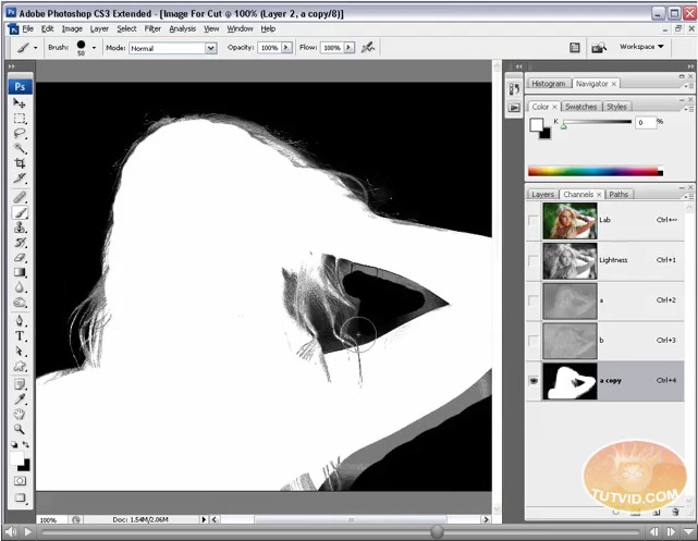 Поэтому приближаем его, берем инструмент Лассо и выбираем весь участок. Идем в палитру Levels и выставляем значения так, чтобы максимально осветлить участок с волосами.24;1.00;100. Снимаем выделение. Сейчас нам нужно занятся мелкими пиксельными фрагментиками которые вылезли на поверхность. Здесь мы берем интструмент Brush и аккуратненько закрашиваем нежелательные участки. Легче будет, если мы загрузим выделение с канала с помощью Magic Wand, так как теперь у нас имеется хорошая и четкая граница контуров тела девушки и инвертировав его, закрасим черной кистью ненужное. Теперь единственной сложностью является этот небольшой участок с волосами. Я выделю его с помощью Лассо. я закрашу его белым, так как знаю, что он тоже нужен. Затем опять же Levels со значениями 16;0.77;149.