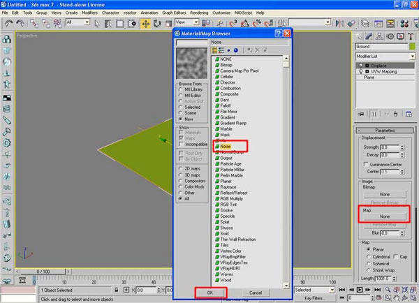 Главная цель написания этого урока состоит в том, чтобы показать вам, как сделать хорошую картину простым моделированием и пост обработки неба. ![]() Часть 1: Моделирование Создайте плоскость размером 1000x1000 с числом сегментов 50x50 - данный объект послужит основой к имитации ландшафта. ![]() Добавьте модификатор UVWMap к вершине стека и убедитесь, что тип маппинга установлен к Planar. ![]() Далее добавьте модификатор Displace, этот инструмент позволит создать холмистые возвышенности ![]() Щелкните на Map и в открывшемся диалоговом окне выберите Noise, перетащив затем эту карту в свободный слот редактора материалов с установленным типом Instance. ![]() Установите Noise Type к Fractal, размер на 165,0, уровень на 3,0 и величины High Tresh на 0,87 и Low Tresh на 0,43. ![]() ![]() Отрегулировав настройки карты, добавьте к слотам Color1 и Color2 другие Noise Map.