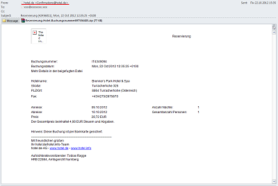 Главные события месяцаПисьма с вредоносными вложениями. Продолжение историиДоля спама продолжает падать, но количество спама с вредоносными вложениями и ссылками на вредоносные ресурсы остается весьма высоким. Много в мусорном трафике и мошеннических писем. В октябре спамеры продолжали активно использовать различные трюки для распространения вредоносных zip-файлов. На этот раз они рассылали письма, подделанные под официальные уведомления о штрафах за превышение скорости, а также уже встречавшиеся нам ранее подделки под сообщения о бронировании отелей и авиабилетов. Появился новый вариант фальшивых вредоносных сообщений о бронировании отелей. Ранее распространялись подделки под сообщения от booking.com на английском языке. Теперь под удар попала известная онлайн-служба резервирования отелей hotel.de, поддельные письма от которой рассылаются на английском и немецком языках. В письме с вложенным вредоносным zip-архивом предлагается подтвердить бронь в 5-звездочном отеле Brenner"s Park-Hotel & Spa в Баден-Бадене. В zip-архиве находится exe-файл, детектируемый "Лабораторией Касперского" как Trojan-Ransom.Win32.Gimemo.atjk. Чтобы нанести вред компьютеру пользователя, кроме фальшивых официальных уведомлений спамеры использовали и более личные темы. Например, злоумышленники рассылали поддельное приглашение на свадьбу, содержащее вредоносное вложение. Политический спамОсенью внимание мирового сообщества было направлено на главное политическое событие в США - выборы президента. В самый разгар предвыборной кампании спамеры предлагали пользователям высказать свое предположение о том, кто станет следующим президентом США, и стать обладателем подарочной карты Visa на 250 долларов. Ввод электронного адреса почты в соответствующем поле такого письма, скорее всего, приведет к тому, что адрес попадет в базу спамеров и будет использоваться для рассылки спам-сообщений самых различных тематик. Нами были замечены и другие рассылки, связанные с темой выборов. Среди них были как призывы поддержать одного из кандидатов, так и реклама пресловутых часов "как у президента". Кроме того, президентская тема использовалась, чтобы заманить пользователей на различные сайты. Пройдя по ссылке в данном письме, пользователь попадал на мошеннический сайт, где ему показывали видео про якобы легкий заработок в интернете. Конечно, никакого отношения к президенту видео не имело. Праздники в спамеПраздник Halloween, с размахом отмечающийся в Европе и Америке, в этом году не был обделен вниманием спамеров. Англоязычные письма пестрили различными предложениями к празднику, в их числе - реклама разнообразных именных сумок, дверных ковриков, фоторамок и футболок, светящихся в темноте. Активно используется тема праздников для рекламы всевозможных распродаж и скидок. На этот раз в честь Наlloween спамеры предлагали приобрести новые и подержанные машины от производителя со скидкой. Оформление рекламы не обошлось без светящейся тыквы и летучих мышей. Традиционно в октябре спамеры начинают напоминать пользователям о приближении зимних праздников. В этом году было зафиксировано множество рассылок на тему Нового года и Рождества, в которых предлагалось приобрести различные сладости, сувениры, билеты на новогодние экскурсии и многое другое. В "новогоднем" спаме товары рекламировались с учетом специ