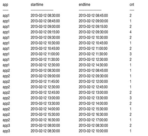 Обратите внимание на интервалы для app3. В исходной задаче требовалось сформировать четыре дискретных интервала. В новой задаче нужно упаковать три смежных интервала в один подсчет, что приводит к двум дискретным интервалам: один начинается в 8:00 и завершается в 8:30 с подсчетом 2; другой начинается в 8:30 и завершается в 10:00 с подсчетом 1. На рисунке 4 показан желаемый результат для малого набора тестовых данных (для простоты отсортированный по приложению и времени начала, хотя от решения не требуется возвращать сортированный результат).