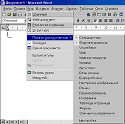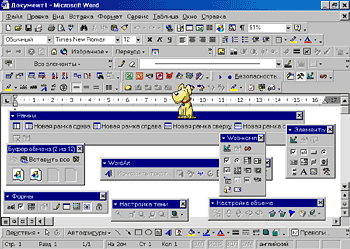 Настройка интерфейса WordДля работы с документом можно использовать свыше тысячи (!) различных встроенных операций Word. Обращение к ним выполняется с помощью команд меню или кнопок на панелях инструментов, расположенных обычно в верхней части экрана. Линейка меню включает только самые необходимые и часто используемые команды. Остальные команды разбросаны по 23-м встроенным панелям инструментов программы (в 1994 году Word 6.0 включал всего 8 панелей). Очевидно, что для обычной работы с определенным типом документов пользователю достаточно всего несколько десятков команд, которые и должны быть представлены на экране. Для сохдания наиболее удобного варианта интерфейса можно применять разные вариаты найстройки. Линейка меню, которая находится в верхней части окна среды Word, представляет собою особую панель - ее нельзя удались с экрана. Все остальные панели инструментов можно добавлять или убирать с экрана и помещать в любую его часть. Конечно, можно вывести на экран все панели инструментов, но тогда не останется места для самого документа (рис. 1). Вывод на экран нужного набора панелей проще всего выполняется с помощью команды Вид/Панели Инструментов (рис.2). Кроме того, для каждой панели можно указать набор кнопок, которые должны быть представлены в данный момент (рис. 3).