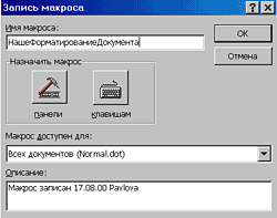Создание собственных макрокоманд методом записиИтак, мы расположили все нужные для работы нам команды в оптимальном виде. Следующий шаг - автоматизация выполнения часто используемых последовательностей операций. Чтобы разобраться, о чем идет речь, давайте рассмотрим такой пример. В редакции некоего журнала принят определенный стандарт для распечатки текстов статей, которые присылают по электронной почте авторы и с которыми должны работать далее редакторы. Например, это должен быть такой формат: тип шрифта - Arial, размер шрифта - 12, расстояние между строк - двойное, форматирование абзаца - с красной строки, отступ - 1 см. Подразумевается, что авторы присылают тексты в формате Word, но каждый тз них использует свой собственный набор параметров форматирования. В ходе первичной обработки такого файла оператор (технический секретарь редакции) преобразовывает его формат к принятому стандарту и распечатывает документ. Все это выполняется по стандартной схеме: