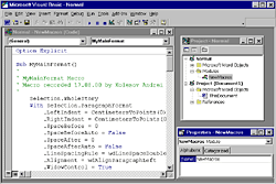 Рис. 6 Обратите внимание, что среда VBA представлена в англоязычном варианте - ее создатель, корпорация Microsoft считает нецелесообразным локализацию для национальных языков средств программирования (с таким подходом можно вполне согласится). Освоение VBA откроет для вас новые возможности офисных приложений и широкие перспективы для повышения эффективности своей работы. Мы же сейчас сделаем только маленький шажок для понимания открывающихся вариантов автоматизации Word. В одном из окон среды VBA вы увидите программный код, который, как можно легко догадаться, выполняет созданную нами макрокоманду: