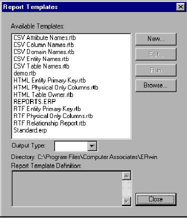 Подсказка: можно прочитать или выполнить ERP-файл отчета, созданный в браузере данных ERwin Data Browser, используя диалог Report Templates (Шаблоны отчетов). Выберите свой ERP-отчет из списка или щелкните Browse (Просмотреть), чтобы выполнить поиск файла.