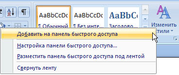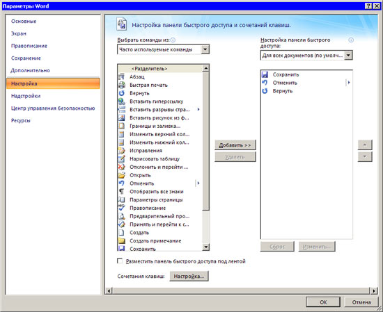 ![]() Добавить другие команды можно из ленты (щелкнуть правой кнопкой и выбрать "Добавить на панель быстрого доступа") или при помощи окна настроек Word (вкладка "Настройка").