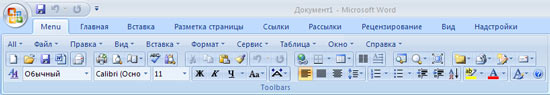 ![]() Правда, сами размеры ленты гораздо больше, чем панелей инструментов "Стандартная" и "Форматирование", которые по-умолчанию отображались в Word более ранних версий и которые, если вы помните, в Word 2003 можно было расположить в одну строку. Правда, ленту можно свернуть, для чего достаточно щелкнуть по ней правой кнопкой мыши и выбрать соответствующую команду в меню.