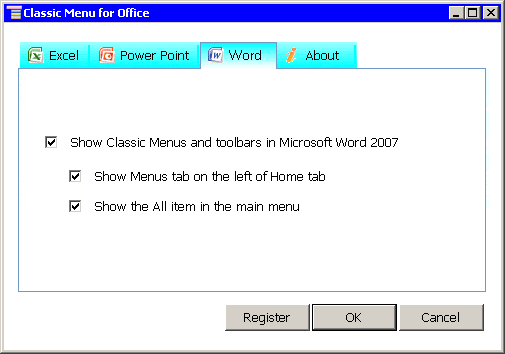 ![]() В окне настроек Classic Menu можно задать варианты отображения элементов старого интерфейса отдельно для каждой из поддерживаемых программ: Word, Excel и PowerPoint.