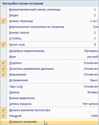 Практически все информационные блоки на строке состояния являются кнопками, предназначенными для быстрого вызова команд. Например, при щелчке по кнопке с количеством страниц открывается окно "Найти и заменить", позволяющее быстро перейти к другой странице документа. Щелчок по кнопке с количеством слов открывает окно статистики документа, где показывается число строк, абзацев, знаков без пробелов и с пробелами. Это очень удобно при написании статей и рефератов. В предыдущих версиях Word вызывать окно статистики было гораздо менее удобно. Если щелкнуть по кнопке, на которой показывается язык, открывается окно выбора языка в текущем документе, для которого будет проверяться орфография. Наконец, щелчок по кнопке, указывающей на наличие орфографических ошибок, приведет к тому, что в тексте будет выделено ближайшее слово с ошибкой. Также откроется контекстное меню, в котором можно будет выбрать вариант замены слова или исключить его из проверки орфографии. Если вам кажется неудобным изменение масштаба при помощи ползунка или вы никогда не пользуетесь кнопкой для проверки орфографии, вы можете убрать эти блоки со строки состояния. В Word 2007 можно настраивать команды, вынесенные на нее. Для этого щелкните по ней правой кнопкой мыши.