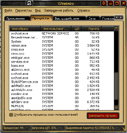 Большинство вирусописателей при написании вирусов в код программы включают алгоритм, который делает процесс невидимым (естественно, это действует не на все утилиты, работающие с процессами) (рис.2). Но, некоторые этого алгоритма не вводят, по этому процесс Трояна легко заметить.