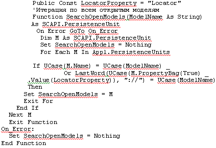 Эта функция помимо того, что показывает, насколько легко проводить итерацию по всей коллекции, также реализует нужную операцию. Имя открытой модели содержит только имя файла, а не весь путь к нему. Это является некоторой проблемой, так как имя модели не уникально. Поэтому нужно использовать свойство Locator, которое задается префиксами "erwin://" или "mmart://" перед полным именем. Сама модель имеет свойство "file name", которое в принципе можно было бы использовать, но оно требует открытия модели. Поэтому использование локатора более эффективно.
