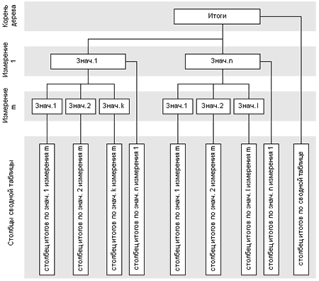 В этом коде пока не указан один элемент – столбец (строка) со значением. О том, чем является это поле, мы поговорим попозже. А теперь перейдем к добавлению элементов в дерево заголовков. Каждый уровень дерева будет соответствовать одному измерению в том порядке, в котором они используются для построения среза. При этом самый верхний узел дерева будет соответствовать полному итогу в сводной таблице.