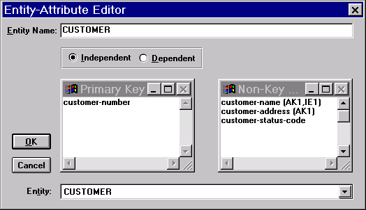 При определении атрибутов Вы можете использовать для наглядности логические имена. В последствии для каждого атрибута Вы можете определить, имя и тип, который он будет иметь в физической базе данных. Кроме понятия первичного ключа в теории существует понятие альтернативного ключа. Альтернативным ключом называется атрибут или набор атрибутов, которые однозначно идентифицируют экземпляр сущности, но по каким либо причинам не используются в качестве первичного ключа. Такой причиной может быть, например частое изменение этих атрибутов. Для того чтобы отметить атрибут, как ключевой, необходимо поставить рядом с именем атрибута в скобках код – АКn (альтернативный ключ номер). Точно также можно отметить атрибут, как входящий в индекс (код - IKn). На этом описание логическое сущности обычно заканчивается. Вы сразу же можете выполнить задание физических параметров сущности, таких как имена полей в базе, их типы, значения по умолчанию, и правила проверки.