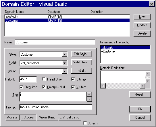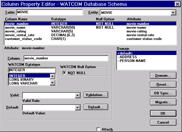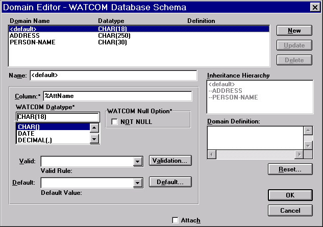 При задании типа атрибута имеется возможность использовать домены. Домен это абстрактный пользовательский тип, который может отображаться на любой конкретный физический тип данных. При этом каждый домен может иметь свои значения по умолчанию и правила проверки вводимых данных. При этом Вы так же имеете возможность задокументировать свои действия по созданию своих типов данных, что облегчает работу в дальнейшем.