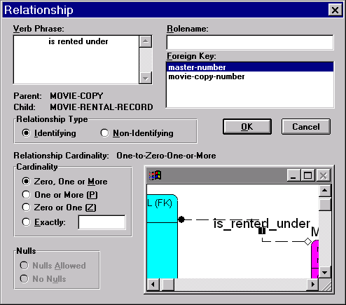 С понятием связи связано понятие внешнего ключа. Внешний ключ (Foreign Key) это атрибут, который может принимать только значения, описанные в первичном ключе другой таблицы. Для того чтобы связать две таблицы достаточно лишь провести линию от родительской к дочерней таблице. При этом первичный ключ родительской таблицы будет автоматически добавлен в список атрибутов дочерней таблицы. Для каждой связи можно задать такие параметры как кардинальность (тип отношения) и тип связи.