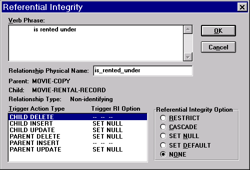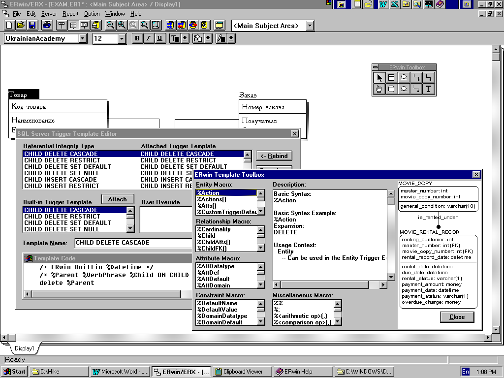Хотелось бы еще раз отметить, что при проектировании базы Вы можете воспользоваться обширным инструментарием Erwin. Все понятия, которые известны Вам из теории реляционных баз данных, доступны для использования. Вы можете описывать атрибуты сущности как первичный, внешний и альтернативный ключи (индексы). В терминах диаграммы Erwin возможно реализовать описание связи типа "класс-подкласс". Система поддерживает оба типа целостности, что существенно облегчает проектирование.