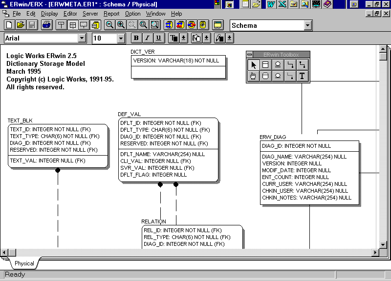 Автор имел возможность работать с несколькими версиями системы и наблюдать процесс ее совершенствования и развития. В данной статье будут описаны возможности версии 2.5 ERwin/ERX, которая является базовым продуктом семейства. Также будут упомянуты особенности расширенных версий расширяющих другие продуктов (SQLWindows фирмы Gupta, PowerBuilder, Delphi, MS Visual Basic).