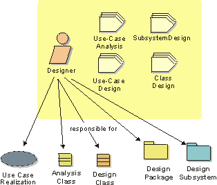 Worker: DesignerThe designer defines the responsibilities, operations, attributes, and relationships of one or several classes and determines how they should be adjusted to the implementation environment. In addition, the designer may have responsibility for one or more Design Packages or Design Subsystems, including any classes own by the packages or subsystems. Staffing