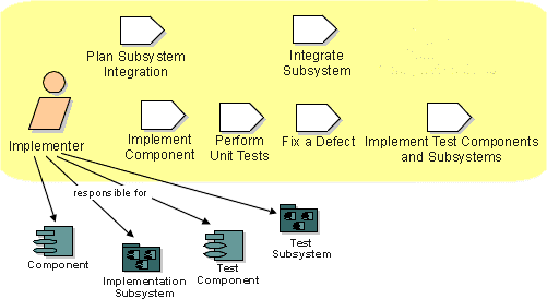 Worker: ImplementerAn implementer is responsible for developing and testing components in accordance with the projects adopted standards such that they can be integrated into larger subsystems. When test components must be created to support testing, such as drivers or stubs, the implementer is also responsible for developing and testing the test components and corresponding subsystems.